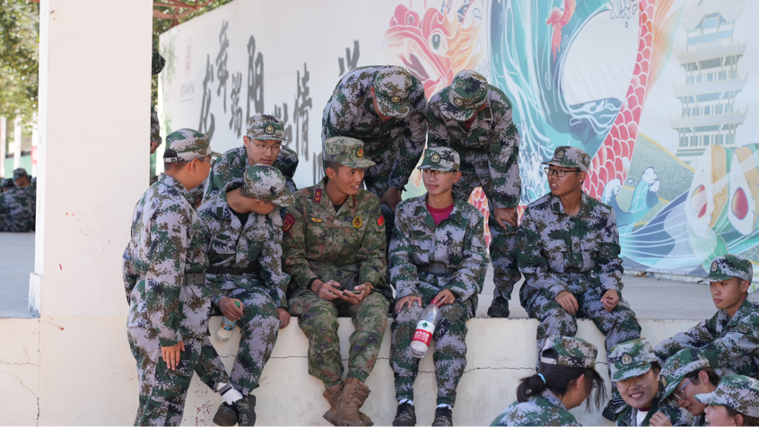 休息的间隙,同学们三三两两侧身谈天,欢声笑语萦绕其中。教官们也融入其中,或是调侃或是认真地指正训练过程中存在的问题,也会聊起对大学生活的向往,对未来的期许。队伍的整体风貌缺不因此被打散,操练哨声响起,便立即整装待发,安静而严肃。