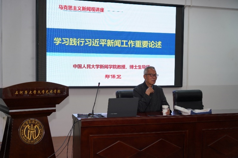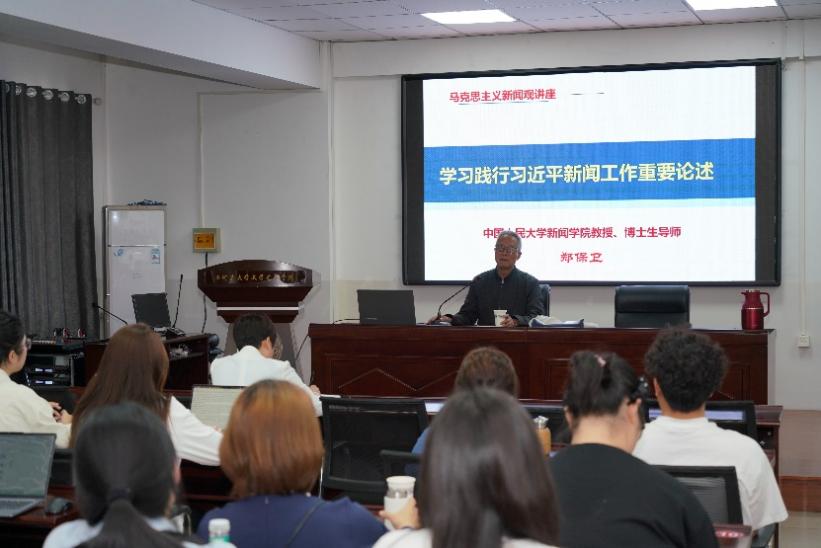 郑教授用丰富的案例阐述了新闻工作者的责任和时代使命。他鼓励同学们要认真学习新闻专业知识,不断提升脚力、眼力、脑力和笔力,“在辽阔的新疆地区,更要做一位‘迈开腿’的新闻人,为党、为国家、为兵团的新闻事业努力学习,做牢固树立马克思主义新闻观的优秀新闻人才。”郑教授特别指出,党领导下的新闻事业的发展对国家的对外传播、对新疆和兵团的形象建构都有着重要的作用。