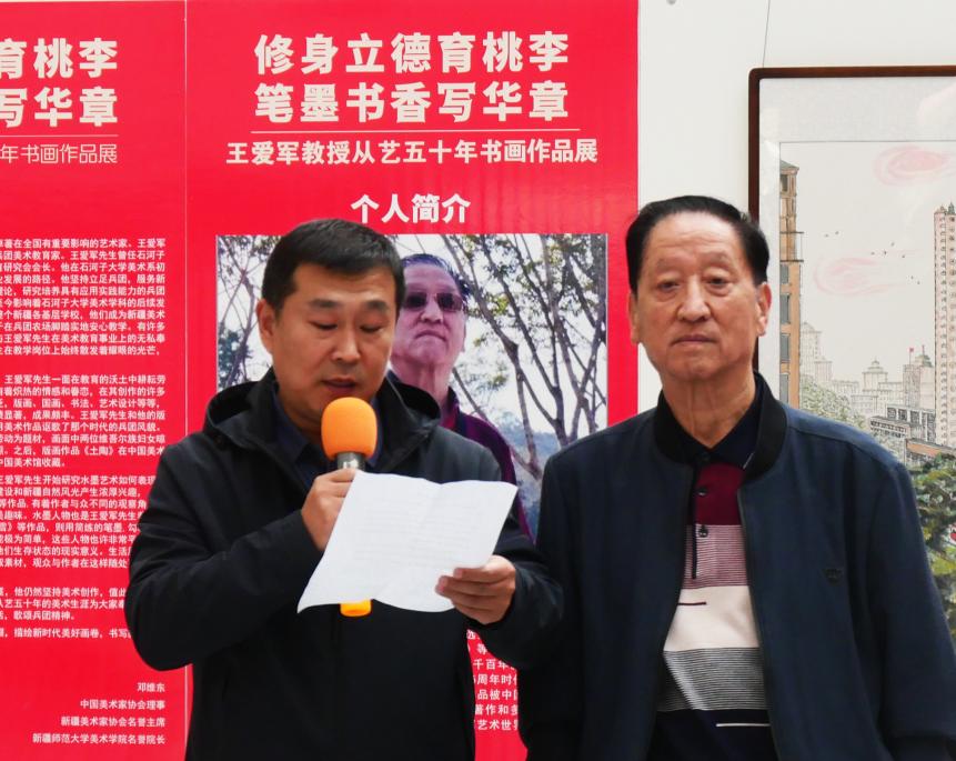 刘洪代表美术与设计系师生,对画展圆满开幕表示祝贺,并受原兵团文联副主席郭承云先生委托诵读其贺信。贺信中说,王爱军教授为人谦和,忠诚实在,踏实勤勉,致力于党的教育事业;他以良好的师风、学风影响了一批批师生,受到广泛赞誉;他专业素养高,艺术成就显著,创作了一批好的书法、版画、国画作品。