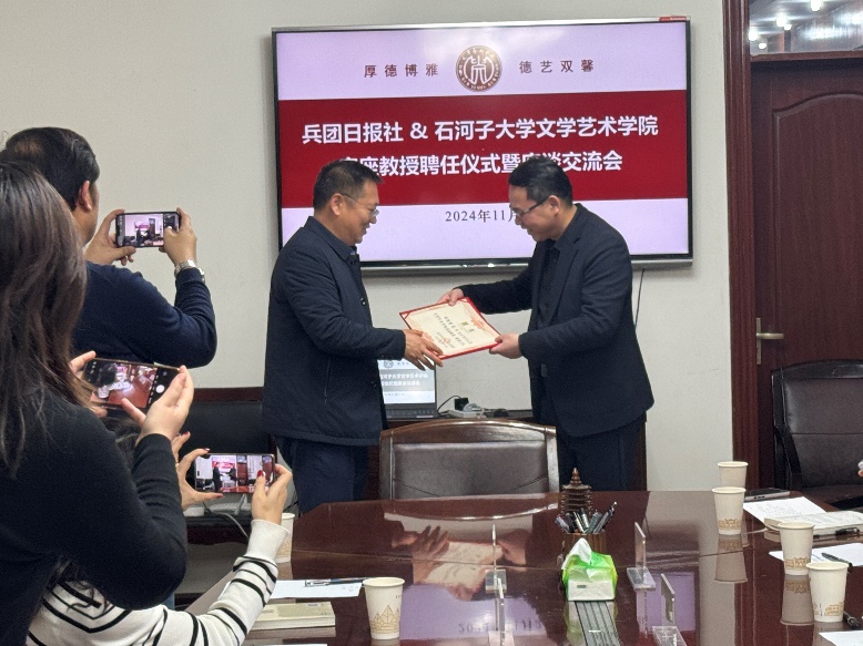 蒋革在发言中表示,“客座教授的角色是沟通理论与实践的重要桥梁,通过这种双向互动,可以更好地帮助学生成长为具有社会责任感和实践能力的传媒人才。”蒋革当面诚恳邀约德赢Vwin官方区域合作伙伴专家参加兵团日报社“胡杨学堂”栏目,通过理论宣讲深化合作。同时,他希望双方在短视频创作、新媒体运营等领域开展深度合作,以适应融媒体时代的新变化。