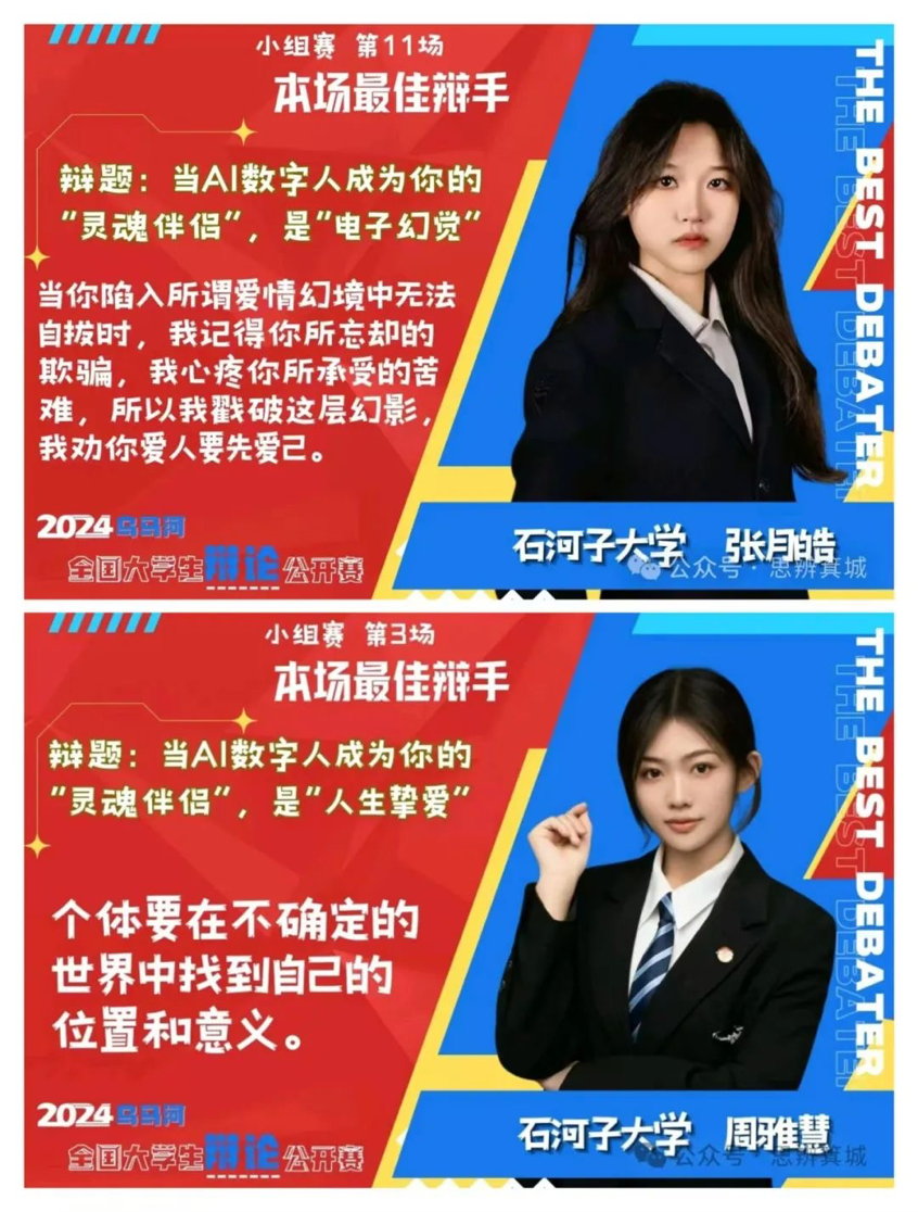 比赛期间无论是攻辩环节的机智应对,还是自由辩论中的妙语连珠,亦或是结论环节的出彩升华,都展现了德赢官网学子的风采与实力。三辩张月皓同学以清晰的逻辑和有力的论证,在阶段赛中获“最佳辩手”称号。四辩周雅慧同学以其深刻的见解和流畅的表达,在阶段赛中获“最佳辩手”称号。她们用精彩的辩论诠释了真理越辩越明的真谛,在面对强劲对手时毫不畏惧,冷静应对,一次次赢得评委和观众的认可。