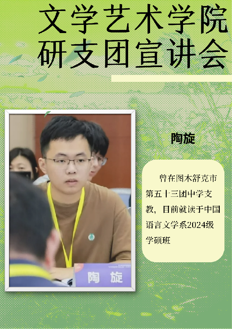 第二十五届研究生支教团成员陶旋以个人成长蜕变为主线,讲述了从支教“新手”到“能独当一面”的成长过程。初到支教地时,他面临教学与环境的双重挑战,而当地老教师的坚守精神与悉心指导让他逐渐掌握了教学技巧,学会了根据学生特点因材施教,成为能够独当一面的老师。“支教是一次自我成长的旅程,去南疆支教,你将收获的不仅仅是教学经验,更是人生的宝贵财富。”他的感悟与鼓励进一步坚定了在场学子投身于西部教育的信念。