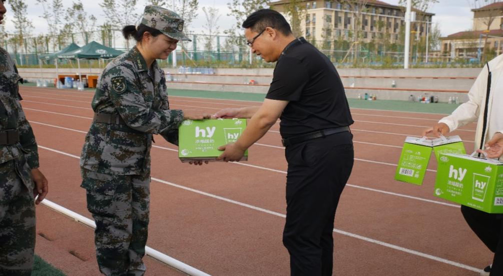 杨院长首先对新生们在军训期间所展现出的坚忍不拔意志与刻苦训练的精神给予高度肯定,随后向始终坚守岗位、辛勤付出的承训教官们表达了衷心感谢。紧接着,学院领导与辅导员们共同为新生分发了精心准备的慰问品——一份份清凉爽口的酸奶,不仅缓解了新生们训练后的疲惫,更将学院对学生的深切关怀与温暖情谊传递到每个人心中。现场掌声阵阵、笑声不断,师生互动频繁,氛围温馨而热烈。